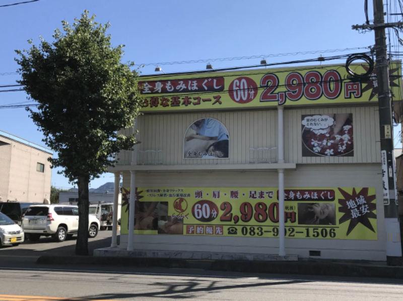 店舗紹介 店名 らくらく全身もみほぐし 山口店 住所 〒747-0054 山口県防府市開出西町32-11 営業時間 8:30~19:30 定休日 日曜日 電話番号 0835-28-7082 駐車場 あり